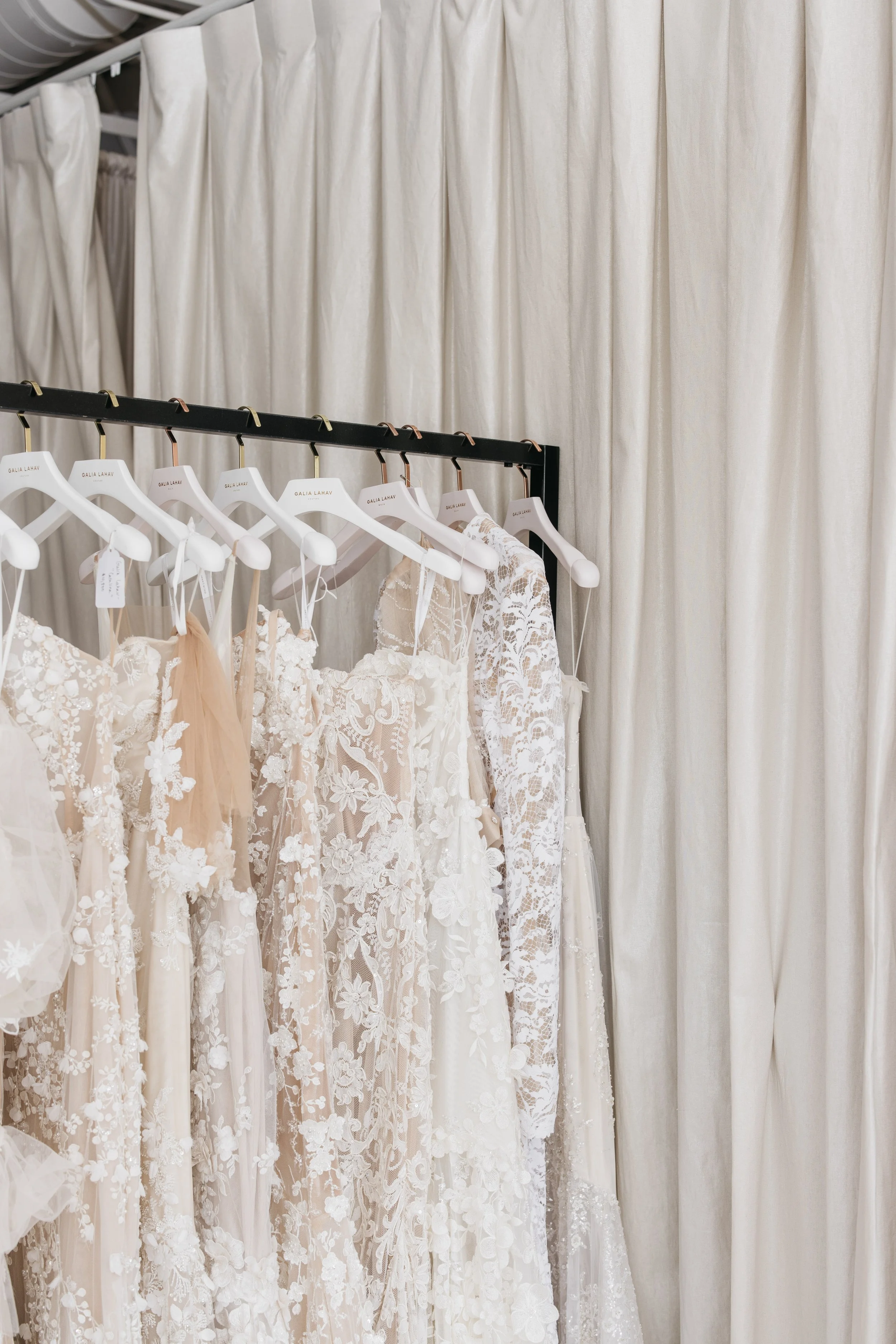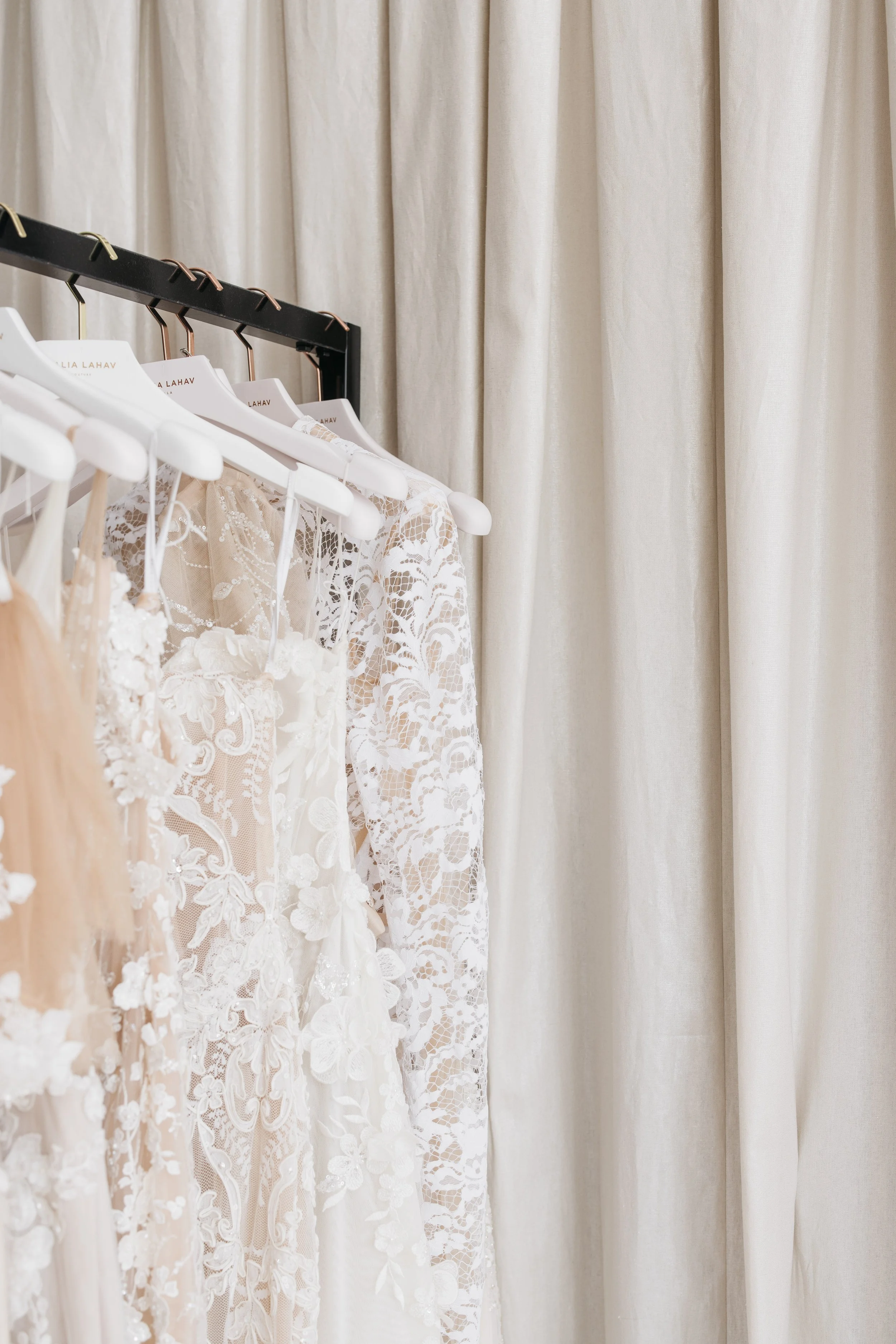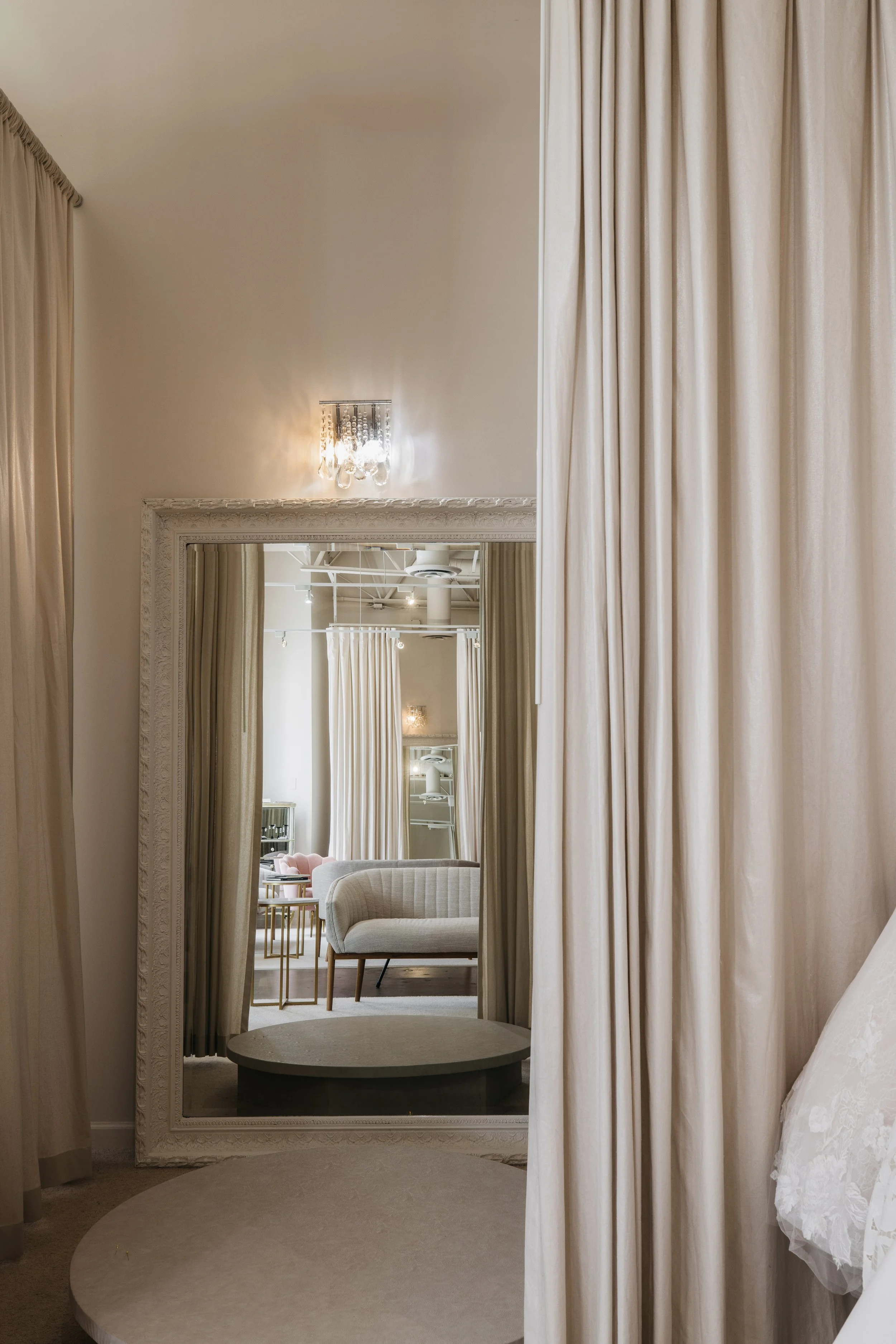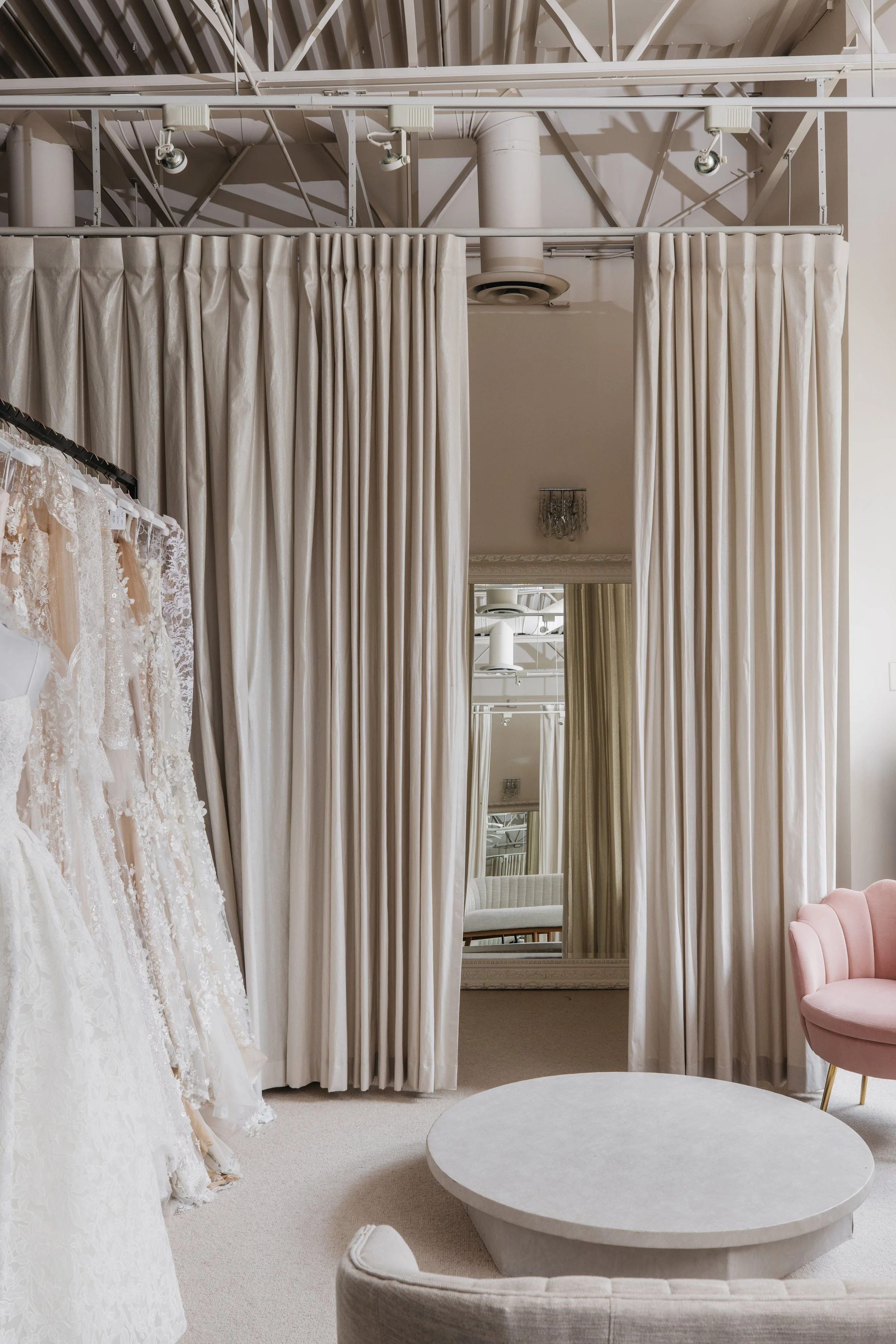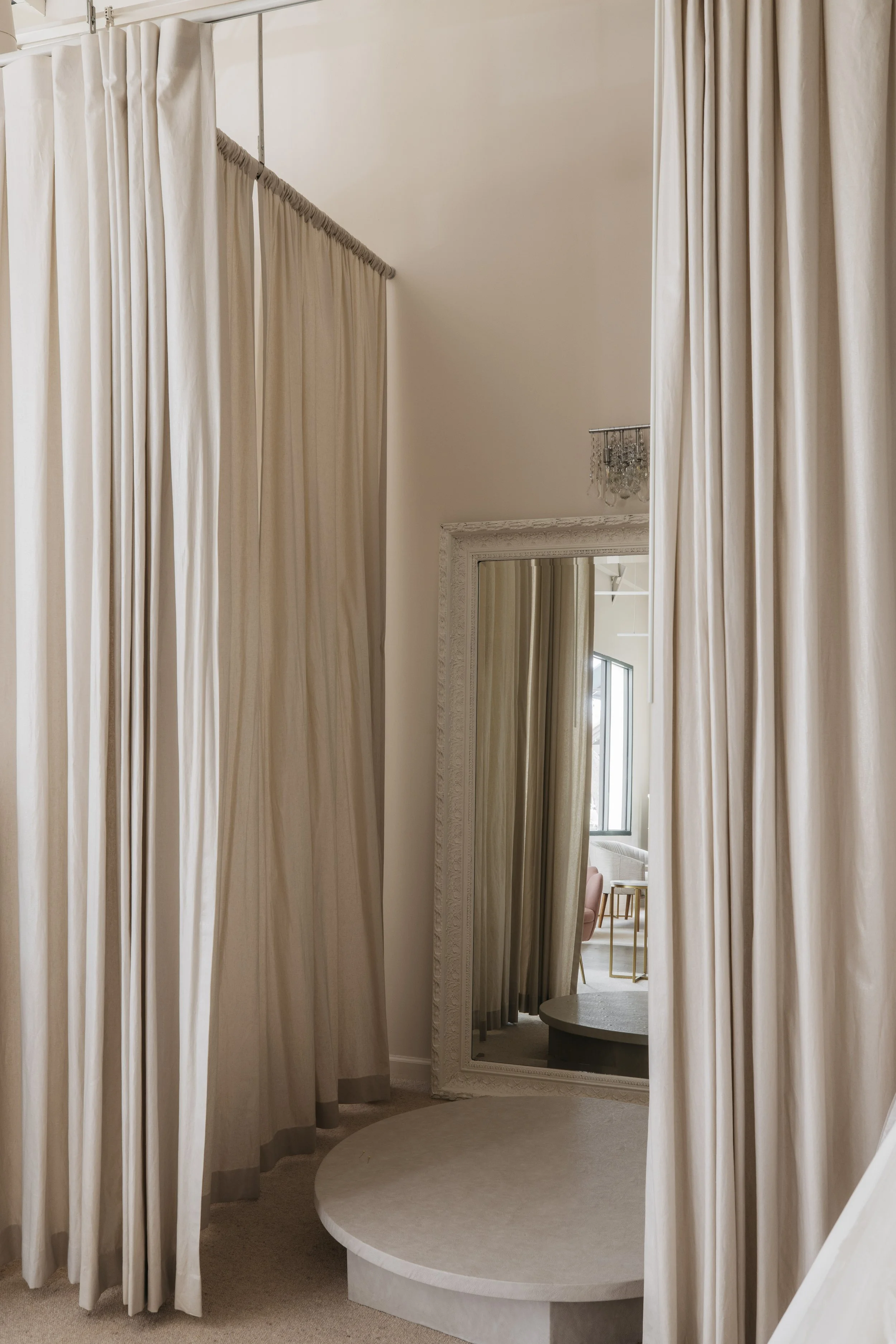 We took an industrial space and made it into a sophisticated salon by adding wool carpet and ceiling length drapery to create individual dressing rooms. The entire space was designed around the custom draperies. The blush fabric of the draperies have a shimmer that reflects the light from the chandelier centered in the runway, making it a magical space. Shopping for your wedding dress at Destiny’s Bride is an elegant unforgettable experience.